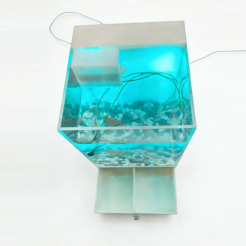 ตู้ปลาอะคริลิคใสทรงสี่เหลี่ยมขนาดเล็กพร้อมไฟในตัว ความจุ 3 ลิตร ไม่ต้องบำรุงรักษา พร้อมระบบกรองอัตโนมัติ ช่องใส่อาหาร/เก็บของด้านล่าง