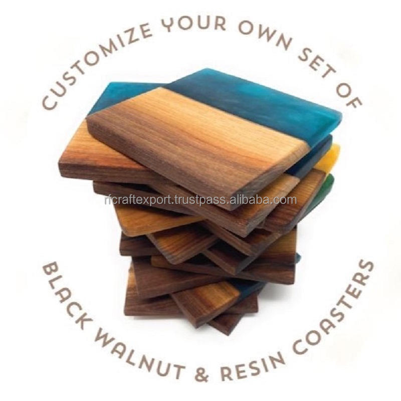 ถาดรองทำจากไม้เรซิ่นรูปทรงสี่เหลี่ยมที่ทันสมัยพร้อมถ้วยชาคริสตัลอีพ็อกซี่ไม้สนจากงานฝีมืออินเดียพร้อมผู้ถือเสื่อและแผ่นรองที่ทันสมัยใหม่