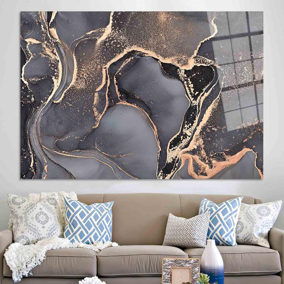 ภาพพิมพ์กระจกสีสไตล์โมเดิร์นบนผ้าใบ: ดีไซน์ลายหินอ่อนสีเทาและสีทองสุดหรู ศิลปะกระจกนิรภัย
