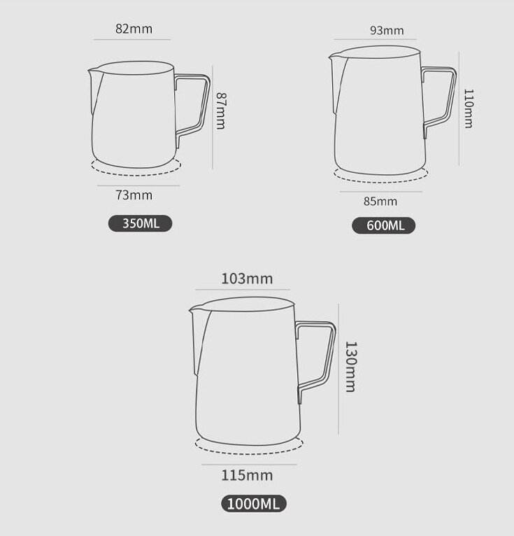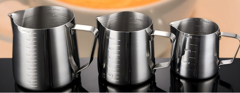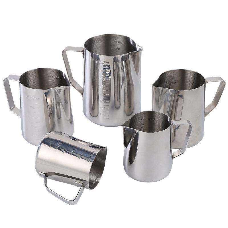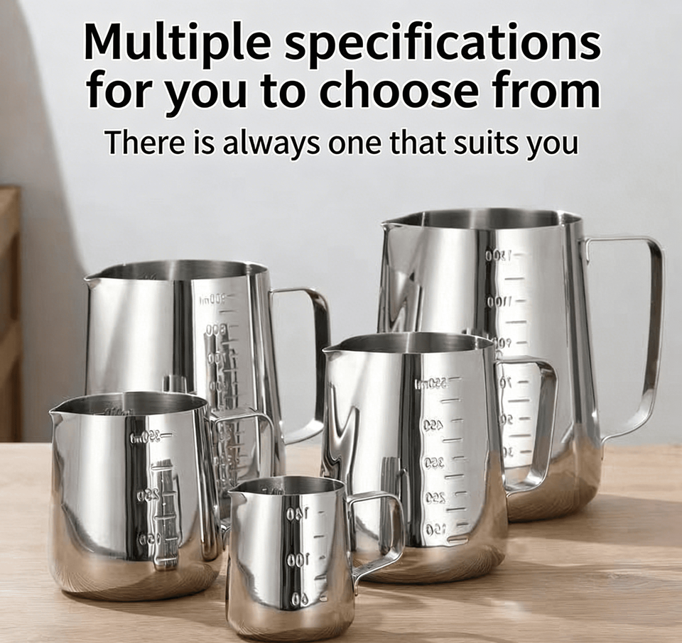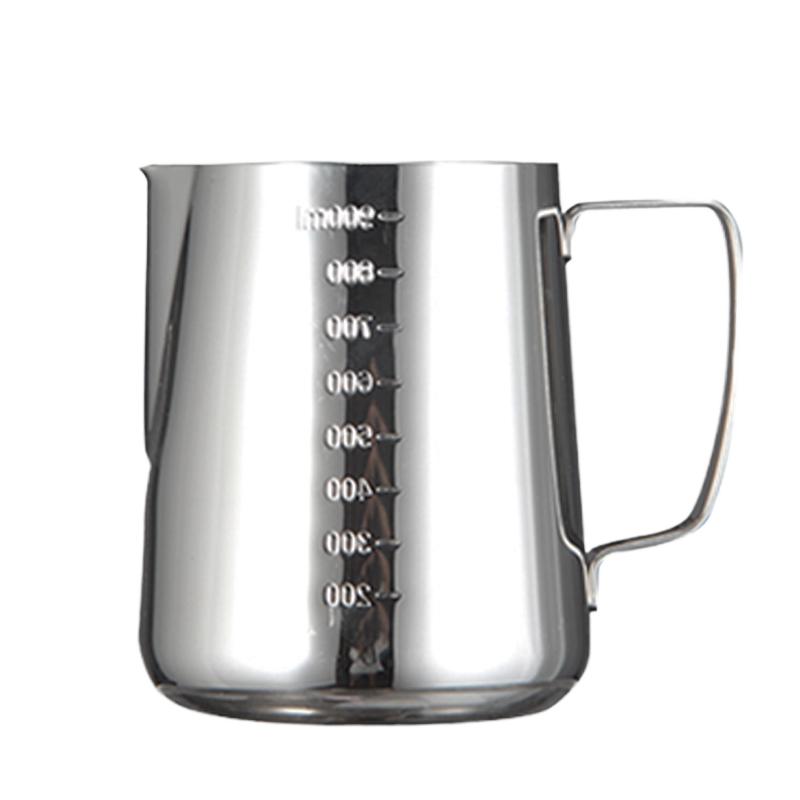 หม้อหลอมเทียนสแตนเลสสตีลทันสมัย พร้อมหูจับตามหลักสรีรศาสตร์ ความจุ 1 ลิตร สามารถปรับแต่งโลโก้ได้ เหมาะสำหรับร้านกาแฟ นม และกาแฟ