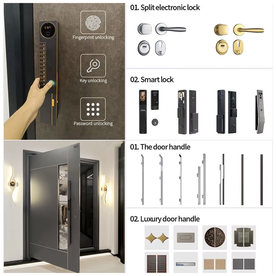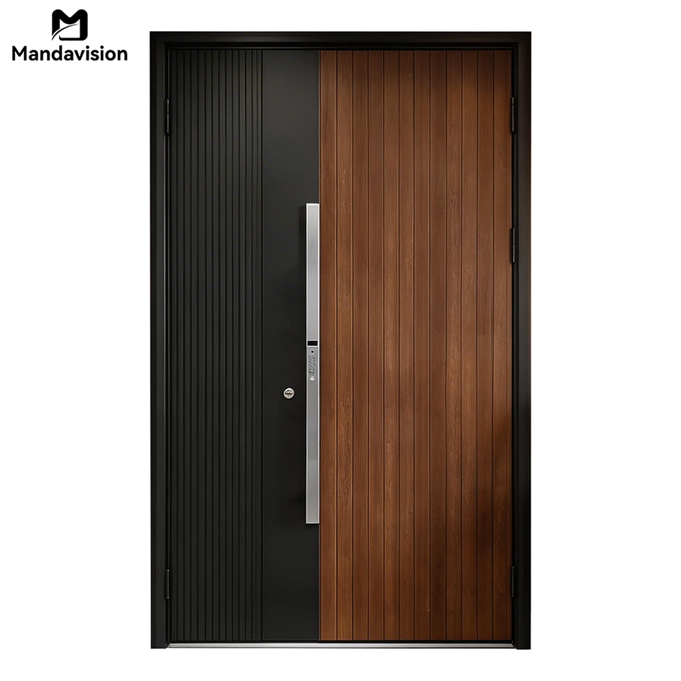 ประตูเหล็กสแตนเลสทันสมัย ดีไซน์แม่ลูกแบบกำหนดเอง ป้องกันการโจรกรรม แผงอลูมิเนียมลายไม้ สำหรับบ้านพักอาศัย