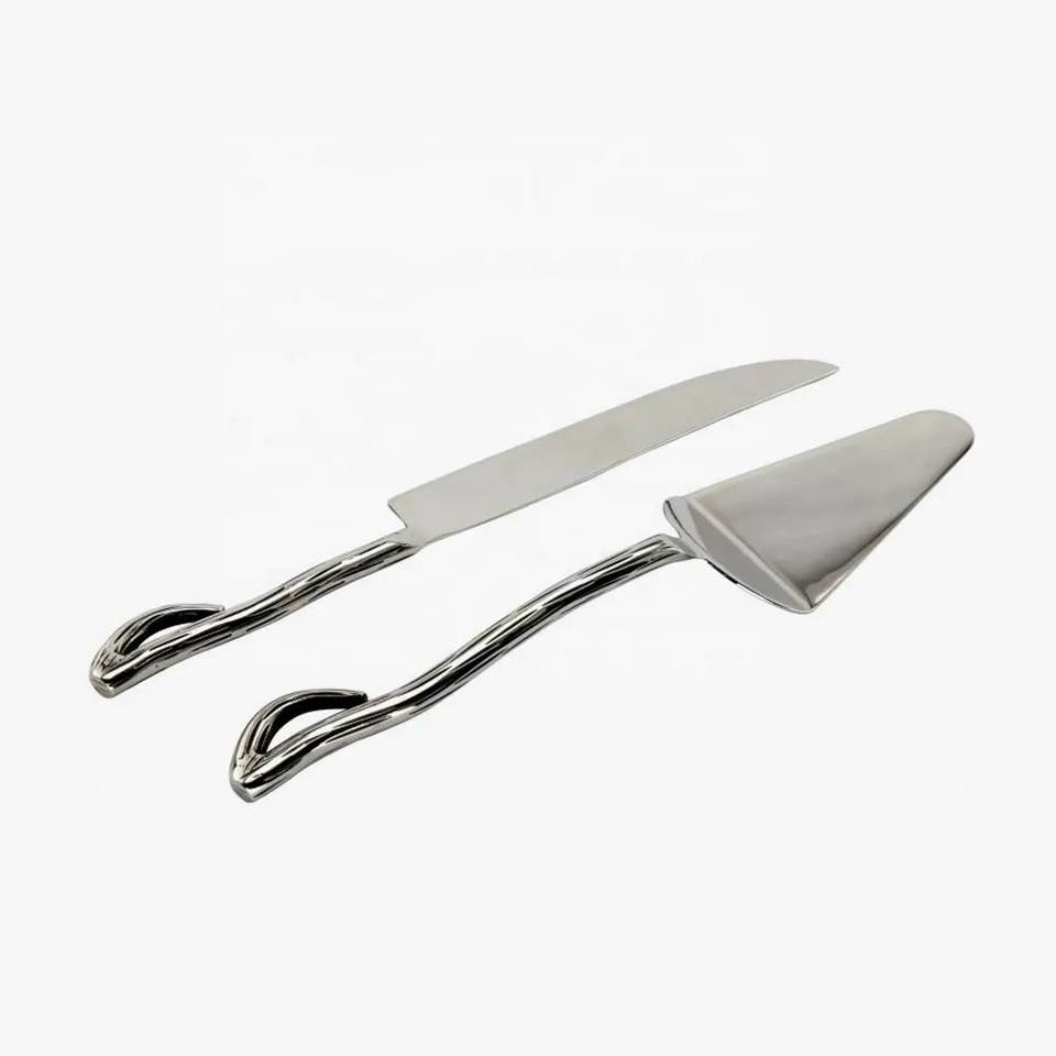 ชุดอุปกรณ์ตัดเค้กแต่งงานสแตนเลสสตีลทันสมัย พร้อมด้ามจับรูปทรงตะขอแบบนูน สำหรับตกแต่งงานเลี้ยงร้านอาหาร อุปกรณ์ตัดเค้กโลหะ