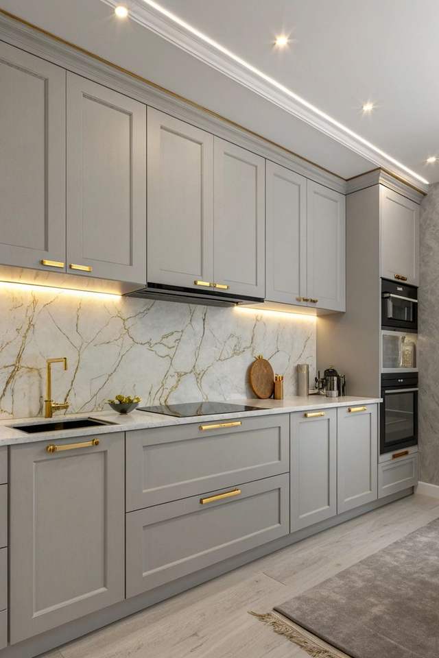 การออกแบบครัวโมดูลาร์ทันสมัยพร้อมพื้นผิวด้าน ระบบจัดเก็บอัจฉริยะ แสงไฟอบอุ่น และสไตล์การตกแต่งภายในบ้านร่วมสมัย