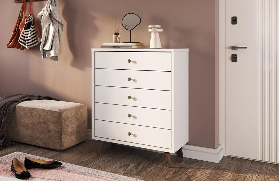 ชุดเฟอร์นิเจอร์ห้องนอนและห้องนั่งเล่นสไตล์โมเดิร์น สีขาว ทำจากไม้อัด พร้อมเตียง 5 ลิ้นชักเก็บของ แบบเลื่อนเปิดได้เต็มที่ ใช้งานง่าย