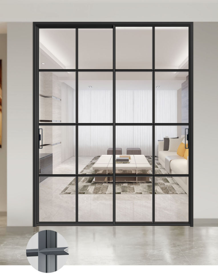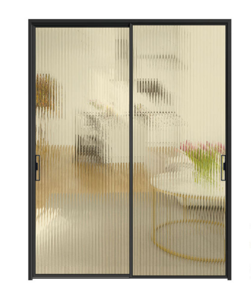 ประตูบานเลื่อนกระจกสีดำสไตล์โมเดิร์น พร้อมกรอบบาง กระจกลายร่อง ป้องกันลม ใช้เป็นฉากกั้นภายในสำหรับวิลล่าและลานบ้าน