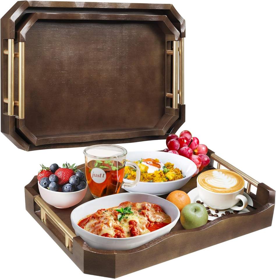 ถาดเสิร์ฟไม้สีน้ำตาลสไตล์โมเดิร์นโลหะตกแต่งอย่างมีสไตล์ พร้อมหูจับ สำหรับอาหารเช้า กาแฟ ของว่าง งานเลี้ยง และตกแต่งบ้าน