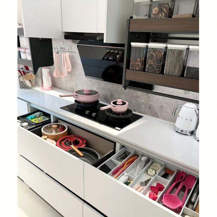 ชุดครัวสไตล์ทันสมัยทำจากไม้และวัสดุคุณภาพสูงสำหรับอพาร์ทเมนต์ขนาดเล็ก