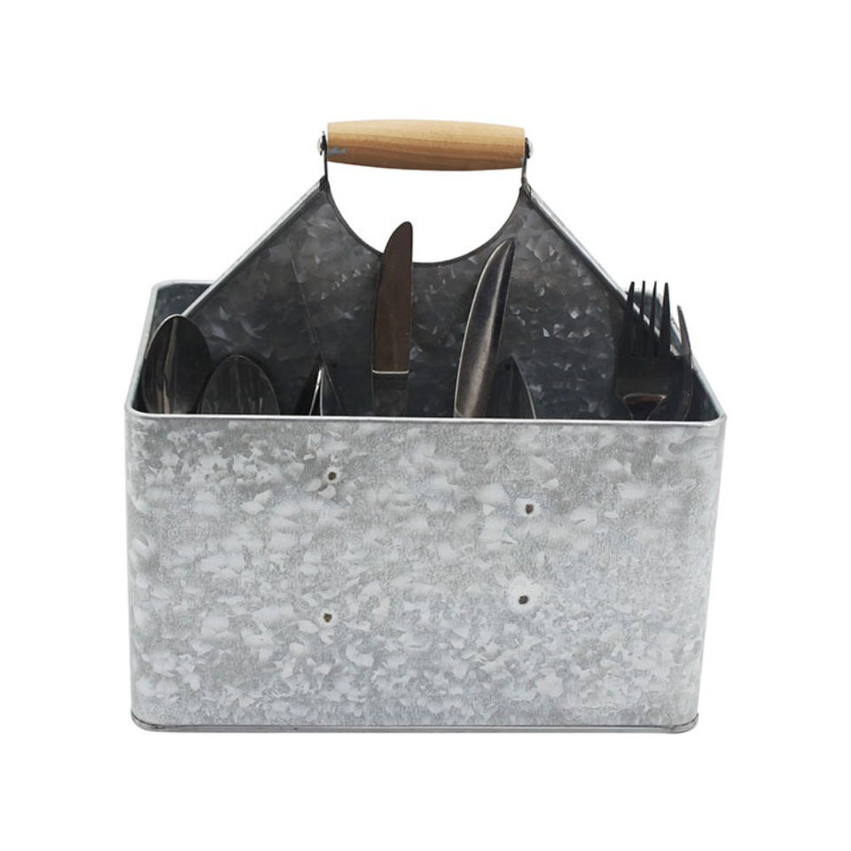ที่ใส่ช้อนส้อมโลหะชุบสังกะสีสไตล์โมเดิร์น พร้อมด้ามจับไม้ สำหรับจัดระเบียบอุปกรณ์ครัว ใช้สำหรับวางบนโต๊ะอาหารในโรงแรม