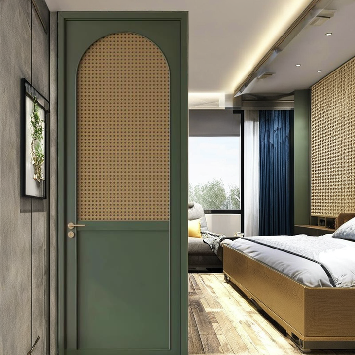 ประตูห้องนอนสไตล์โมเดิร์นทำจากหวายและไม้เนื้อแข็ง พร้อมกระจกโค้งสีสันสวยงาม ป้องกันเสียงรบกวน