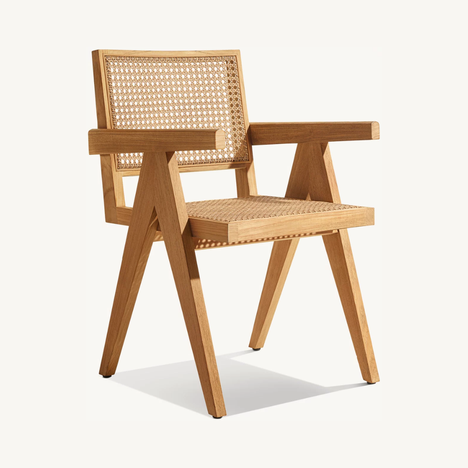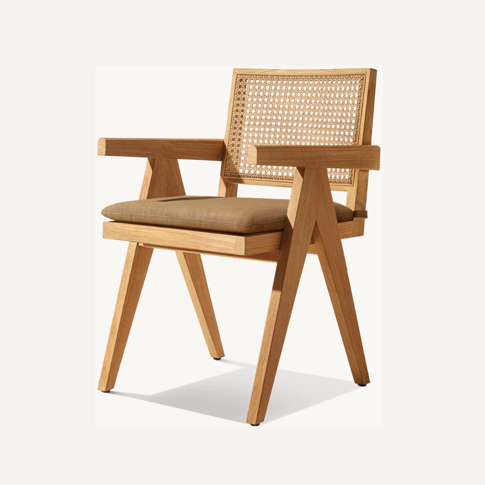 เก้าอี้รับประทานอาหารทำจากไม้สักเนื้อแข็งสไตล์โมเดิร์นพร้อมเบาะรองนั่งหวายธรรมชาติสำหรับใช้กลางแจ้งในวิลล่าร้านอาหารโรงแรมยี่ห้อเอ็มม่า