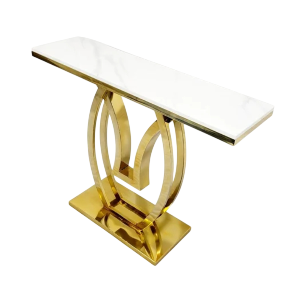 โต๊ะคอนโซลทันสมัยมีสไตล์ พร้อมฐานสแตนเลสสีทองรูปตัวยู และท็อปหินอ่อน สำหรับห้องนั่งเล่น ทางเข้าบ้าน และโถงทางเดิน