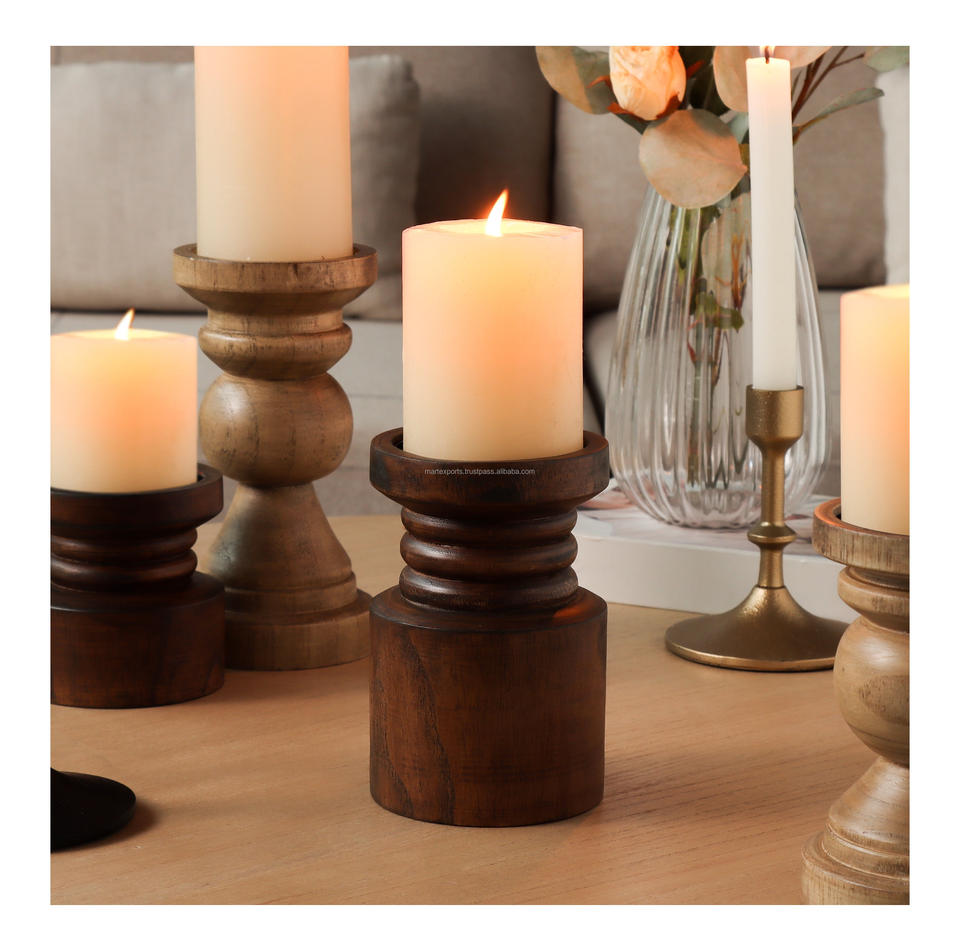เชิงเทียนไม้ทำด้วยมือที่ทันสมัยสำหรับตกแต่งบ้านหรือสำนักงานด้วยโคมไฟไม้และขวดเทียนที่เป็นเอกลักษณ์