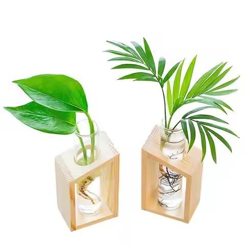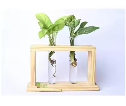 Modern Stylish and Elegant Glass Flowers Vase with Wooden Holder Decorative Tabletop Glass Vase