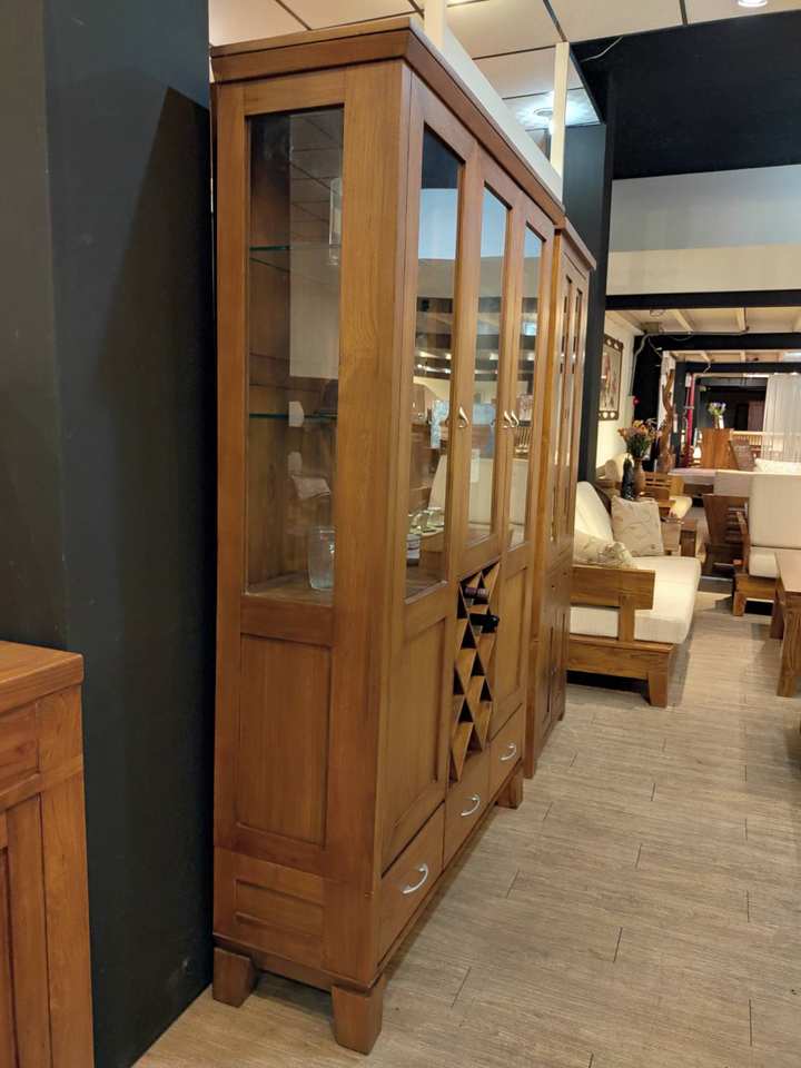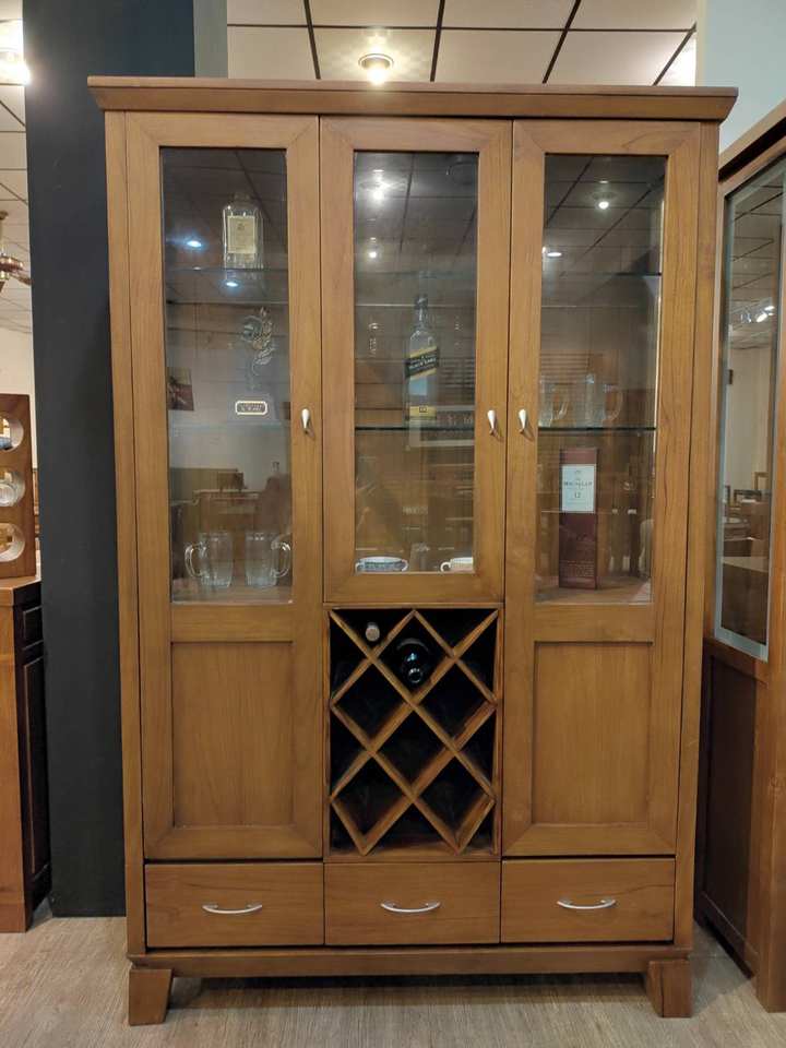 ตู้เก็บไวน์ไม้สักดีไซน์ทันสมัย สวยงาม แข็งแรง ทนทาน สำหรับห้องนั่งเล่น 3 ประตู 3 ลิ้นชัก พร้อมที่กั้นขวดและขอบหลังคา