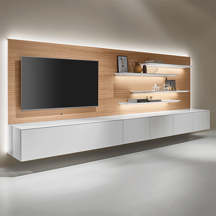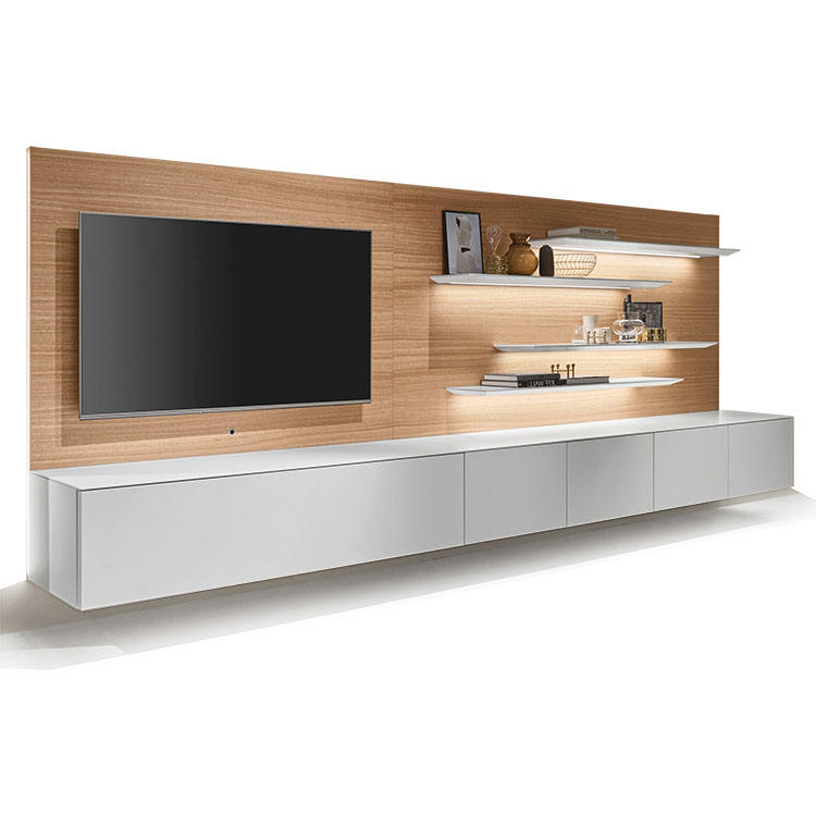 ดีไซน์ตู้วางทีวีสมัยใหม่พร้อมไฟ LED สีขาวและลายไม้