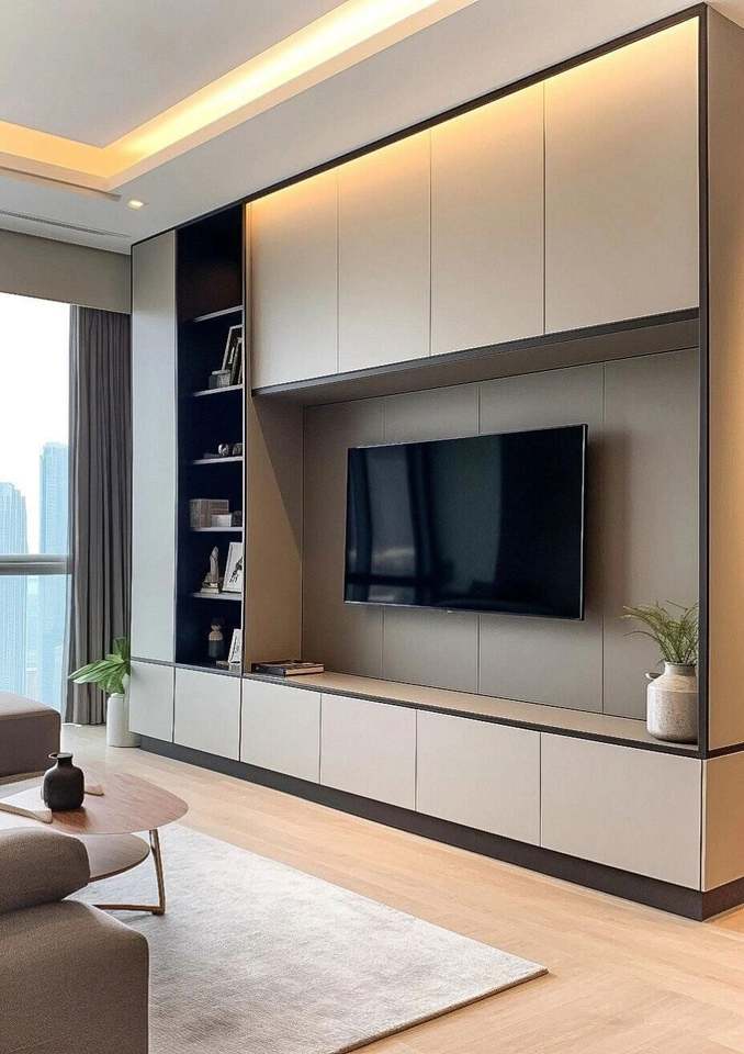 Modern Tall Wall Mount TV Cabinet Wood Panel Style with Full Wall Storage for Home Dining Office for Living Room Bedroom Hotel