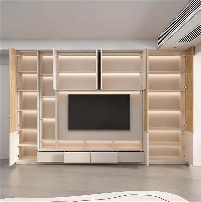 Modern Tall Wall Mount TV Cabinet Wood Panel Style with Full Wall Storage for Home Dining Office for Living Room Bedroom Hotel