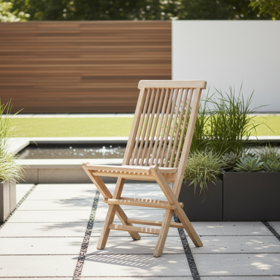 เก้าอี้รับประทานอาหารพับได้สำหรับกลางแจ้ง ทำจากไม้สักทันสมัย เป็นมิตรกับสิ่งแวดล้อม สีธรรมชาติ เหมาะสำหรับใช้ในวิลล่า สวนสาธารณะ และสวน