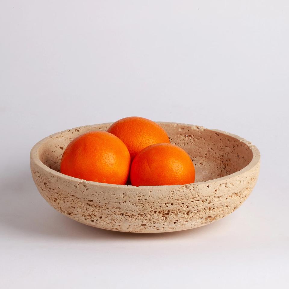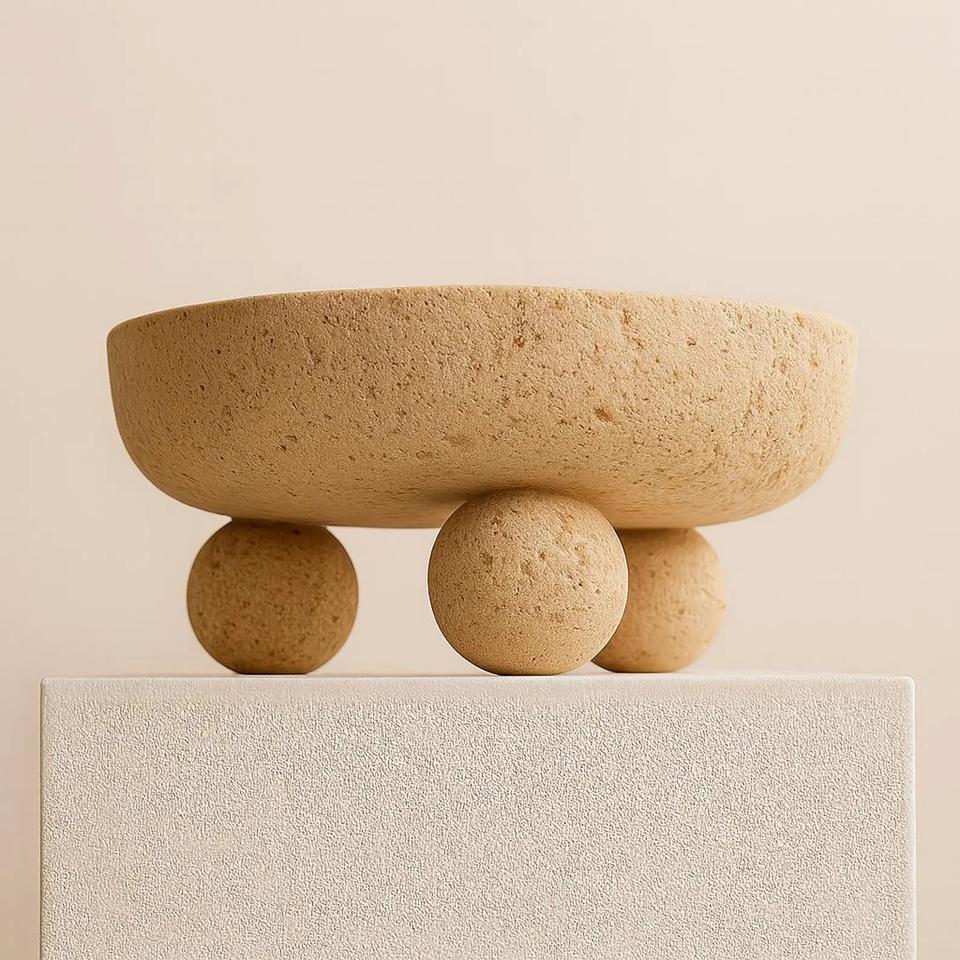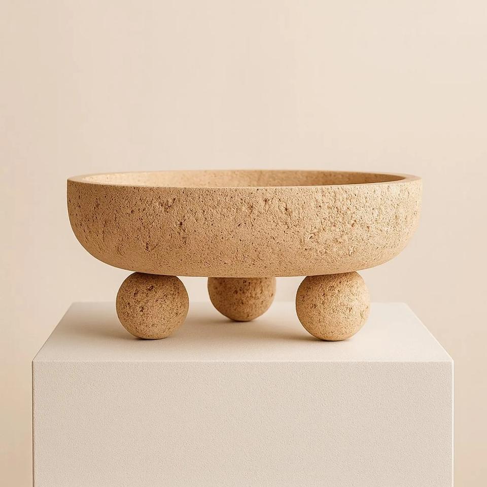 ชามหินทราเวอร์ทีนสมัยใหม่พร้อมฐาน ผิวสัมผัสธรรมชาติ สำหรับตกแต่งบ้านหรูหราและเป็นของตกแต่งที่มีสไตล์