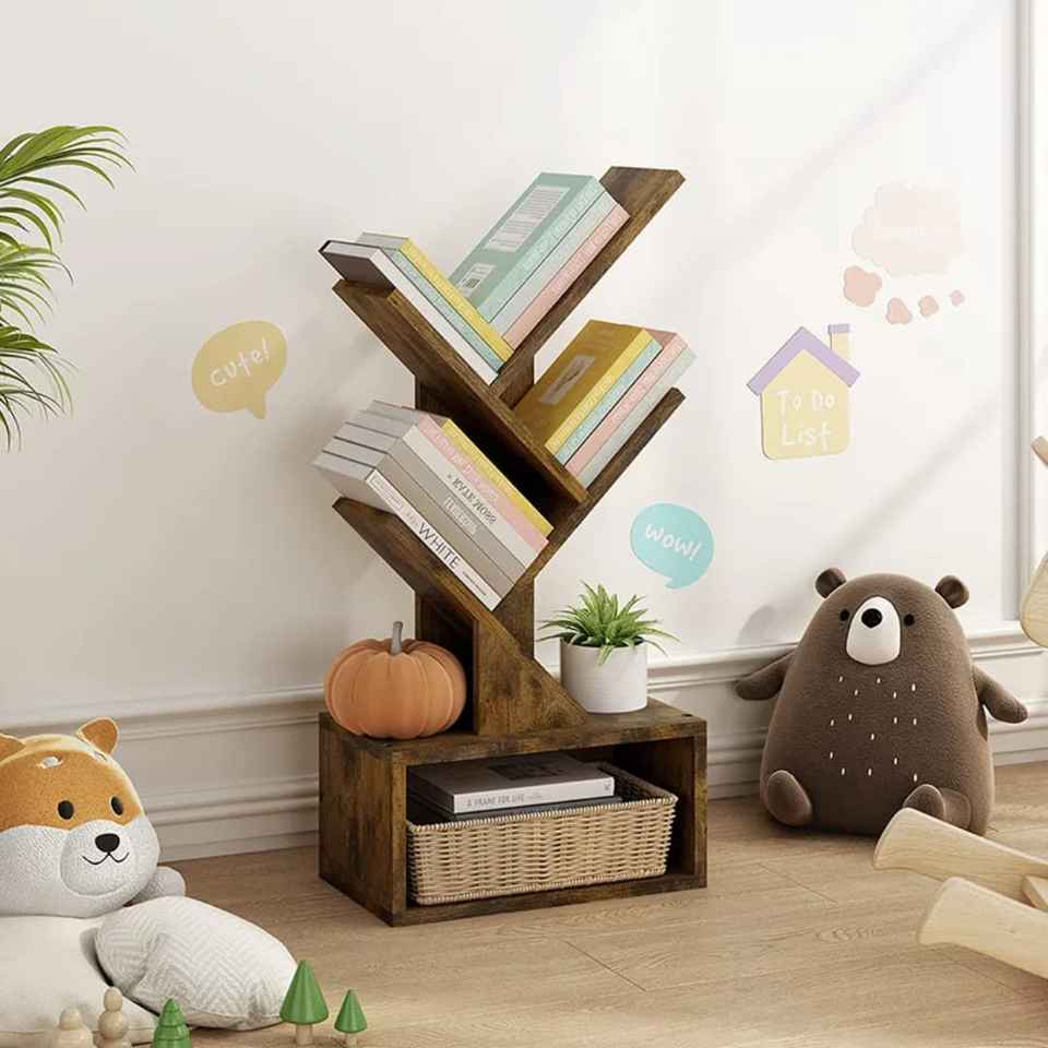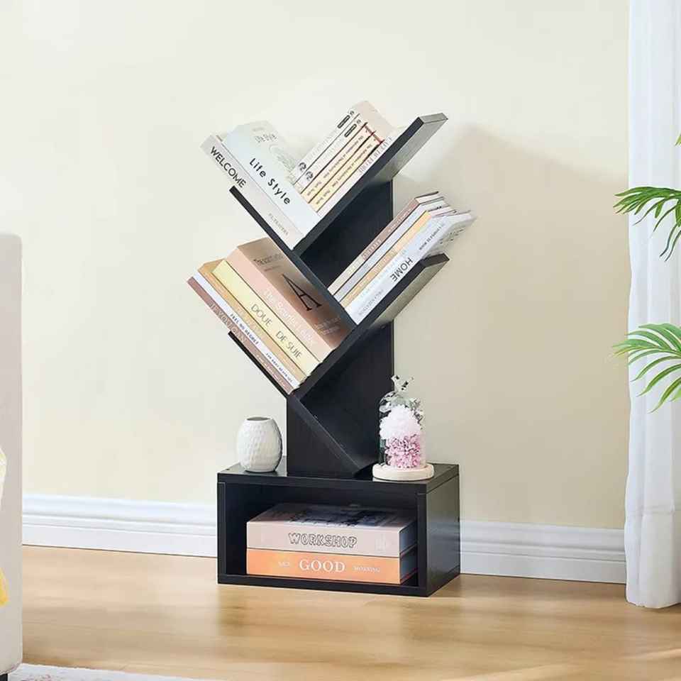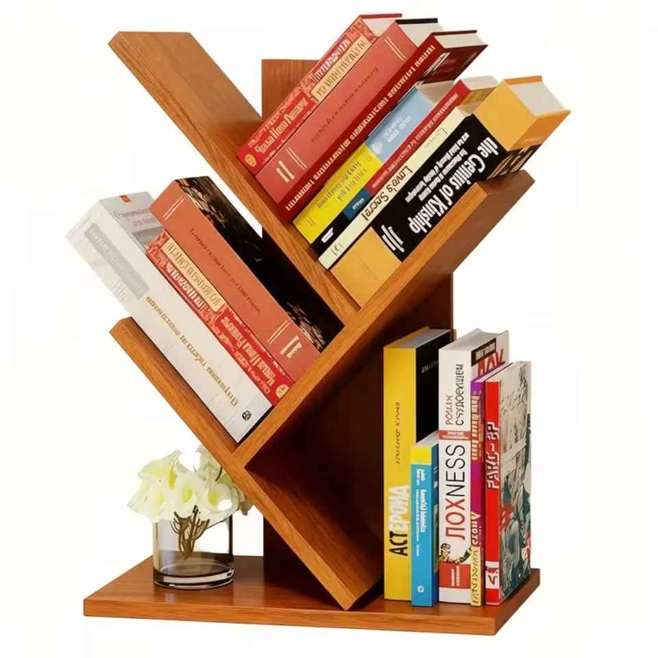ชั้นวางหนังสือทรงต้นไม้ทันสมัย 5 ชั้น ชั้นวางหนังสือไม้แบบตั้งพื้น ชั้นเก็บของแนวตั้งขนาดกะทัดรัด สำหรับบ้าน สำนักงาน ห้องนั่งเล่น