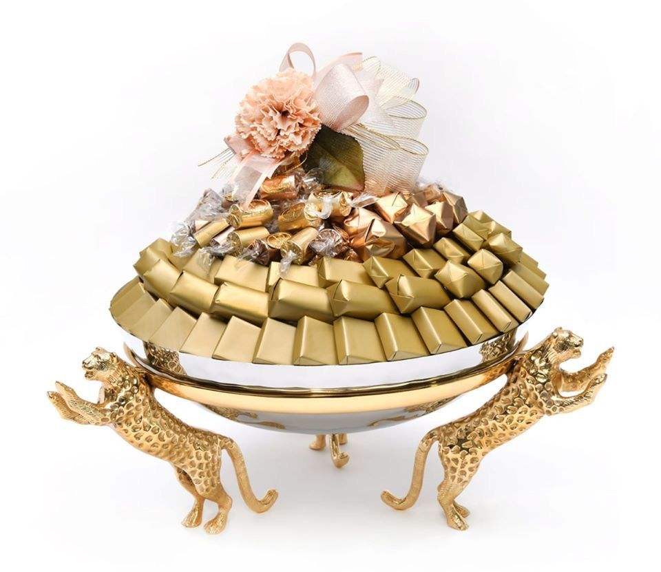 ถาดใส่ช็อกโกแลตโลหะสีทองสองชั้นทันสมัย ดีไซน์เรียบหรู สำหรับเสิร์ฟขนมหวานบนโต๊ะ
