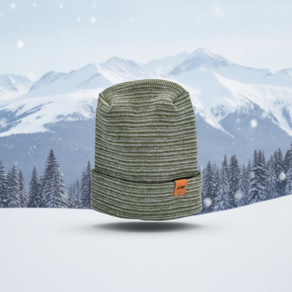 หมวกบีนนี่ทรงทันสมัยแบบเย็บตะเข็บเทตา ขอบหมวกตัดสี เทาเขียว ผลิตจากอะคริลิกคุณภาพพรีเมียม ผลิตในสหรัฐอเมริกา อุปกรณ์เสริมสำหรับกีฬาฤดูหนาว