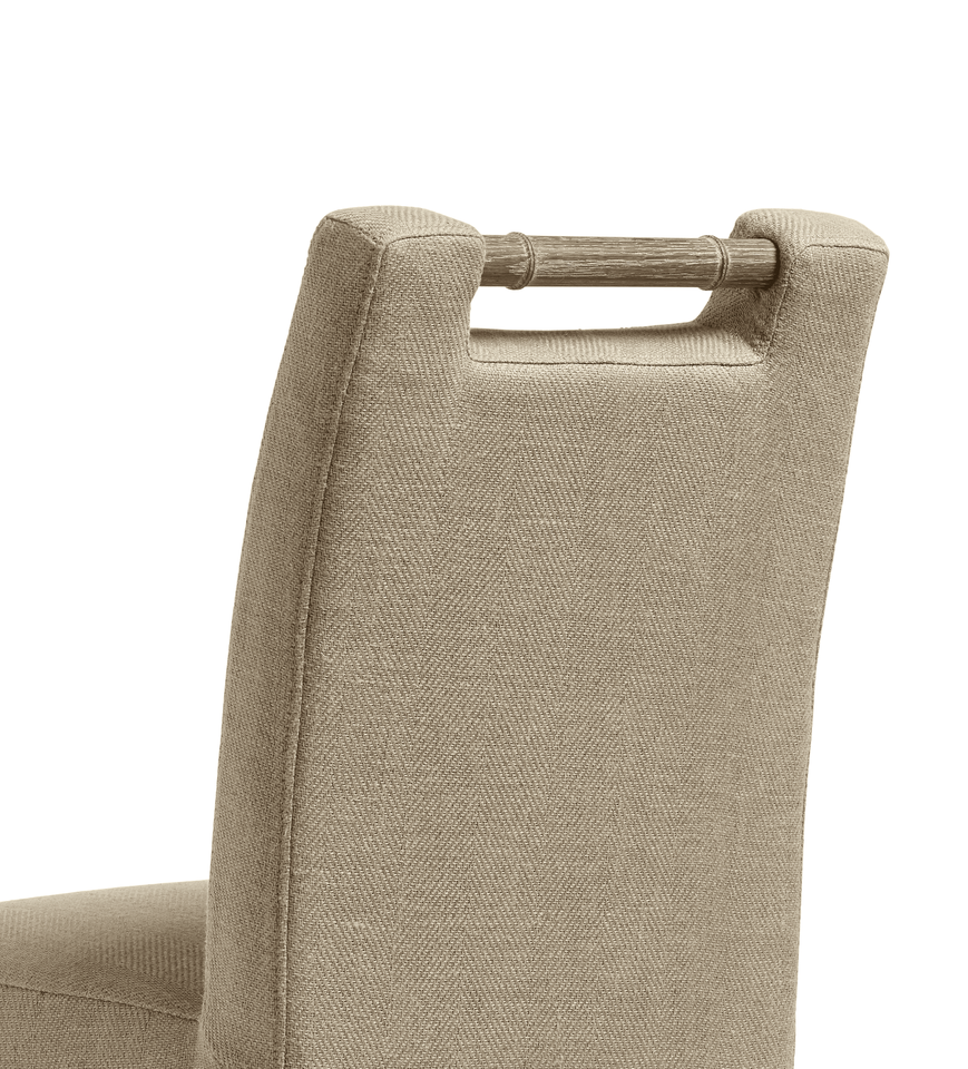 เก้าอี้ทานอาหารหุ้มเบาะสไตล์โมเดิร์น พร้อมที่จับไม้ไผ่ฝังลาย และขาไม้เนื้อแข็ง