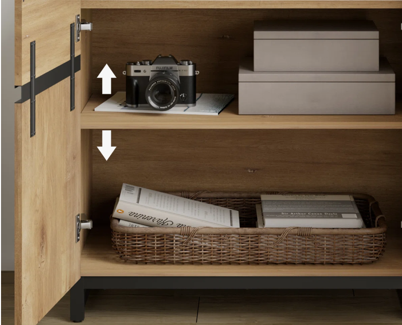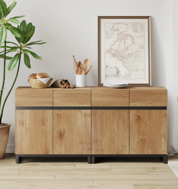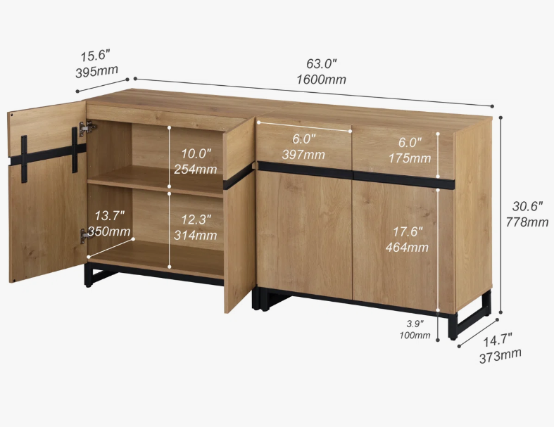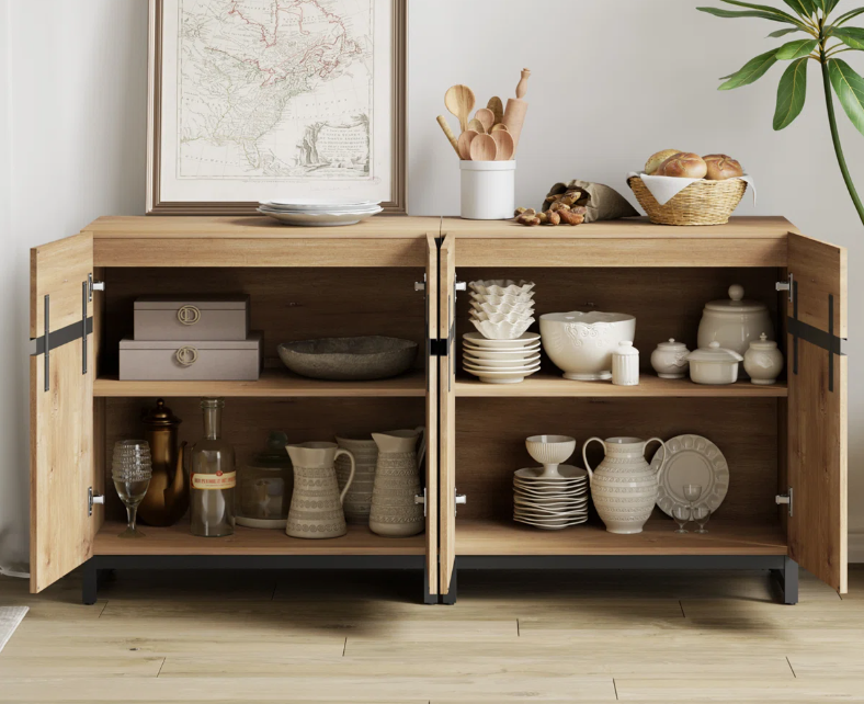 ตู้ไซด์บอร์ดไม้มะม่วงสไตล์โมเดิร์นวินเทจอินดัสเทรียล พร้อมบานประตูเหล็กสองบาน สำหรับใช้ในห้องครัวหรือห้องรับประทานอาหารที่บ้าน