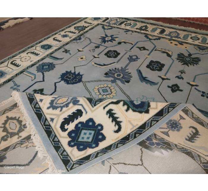 พรมอูชักสไตล์วินเทจสมัยใหม่ ลายพฤกษศาสตร์ทั่วทั้งผืน ดีไซน์ดอกไม้และรูปทรงเรขาคณิต ทำจากขนสัตว์ สีฟ้าพาสเทลและสีขาว