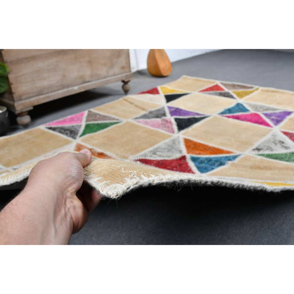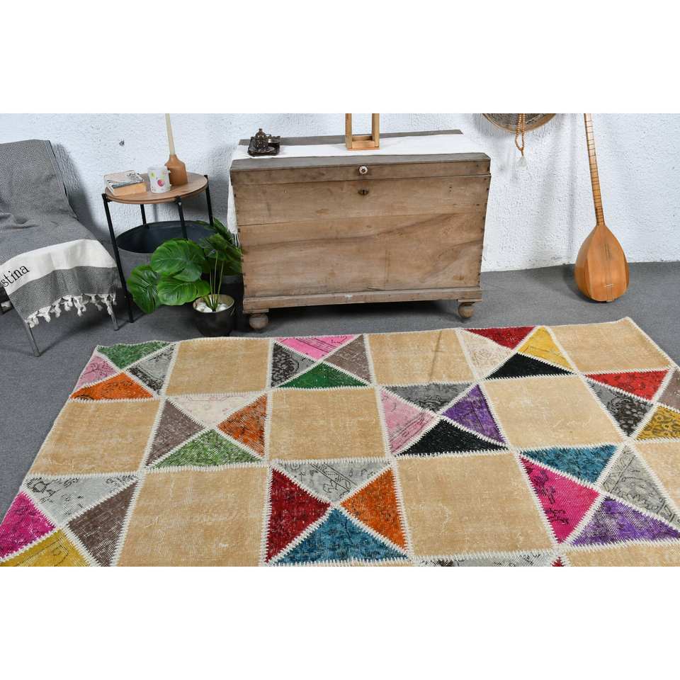 พรมตุรกีโบราณที่ทันสมัย5.2x7.7ft สีเบจคลาสสิกรูปสี่เหลี่ยมผืนผ้าการออกแบบการเย็บปะติดปะต่อกันสำหรับห้องนั่งเล่นห้องนอนขนแกะโพลีเอสเตอร์