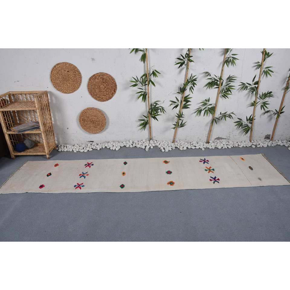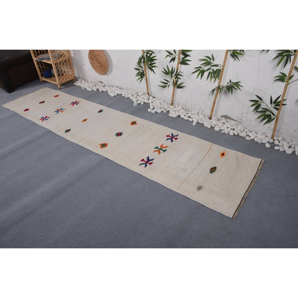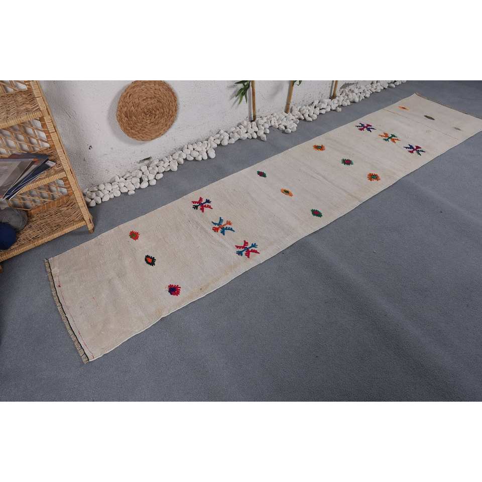พรมยางสไตล์ตุรกีโบราณแบบโมเดิร์นเรขาคณิตสีขาว (2.2 x 9.8ft) วัสดุขนสัตว์สำหรับตกแต่งห้องนั่งเล่นสำหรับวัยรุ่น
