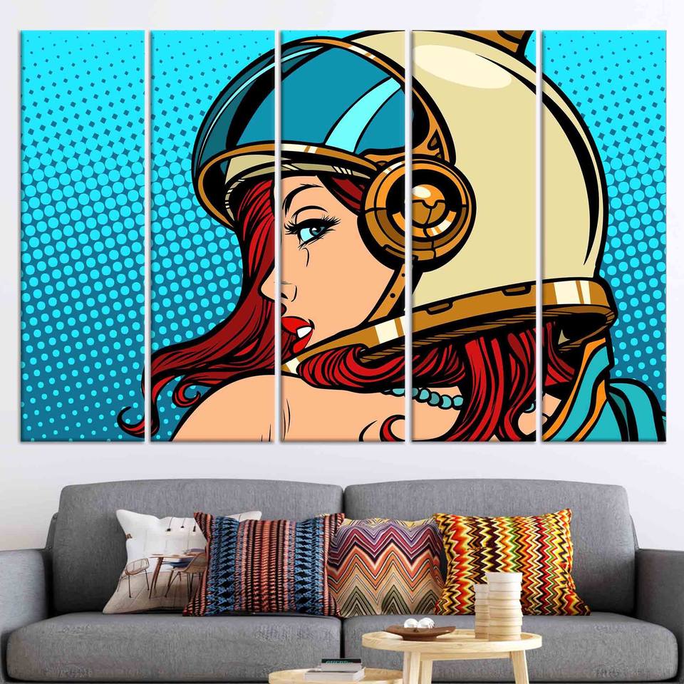 ของตกแต่งผนังสมัยใหม่: ภาพพิมพ์บนผ้าใบลายศิลปะป๊อปอาร์ต นักบินอวกาศหญิง ชุดผ้าใบ 5 ชิ้น