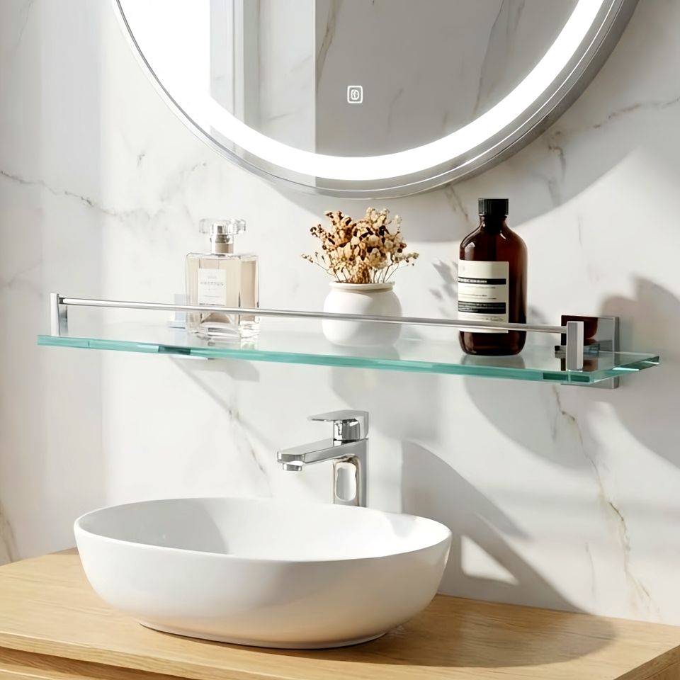 ชั้นวางของในห้องน้ำแบบติดผนังทรงสี่เหลี่ยมทันสมัย ทำจากกระจกและโลหะเคลือบโครเมียม ทนทานสำหรับใช้ในบ้าน
