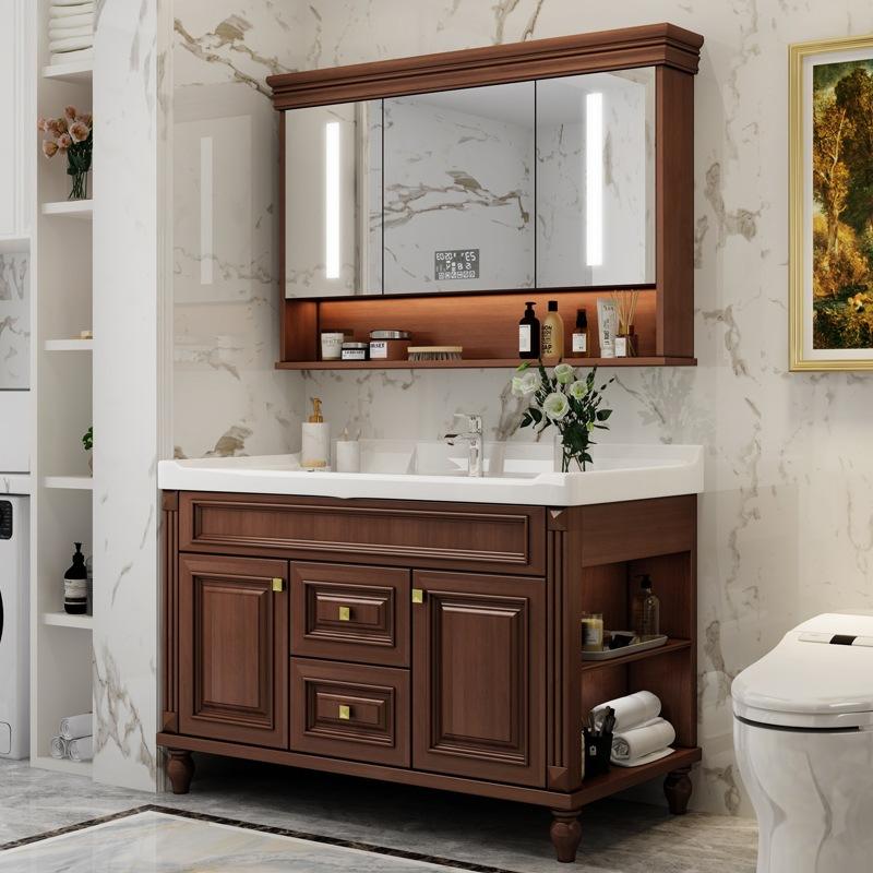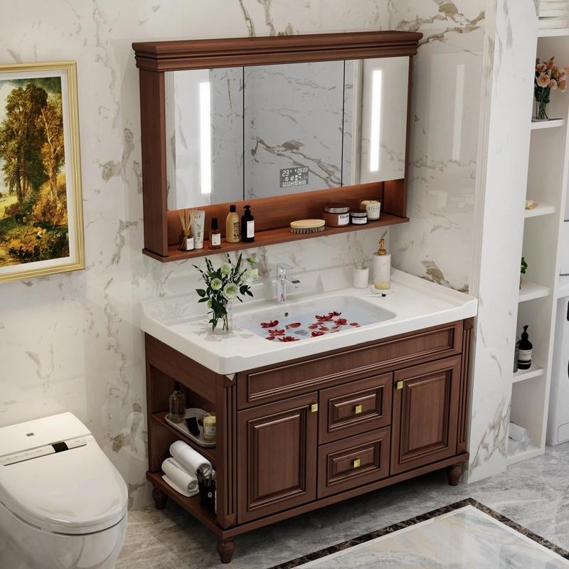 ตู้ห้องน้ำไม้วอลนัทเคลือบเงาแบบโมเดิร์น พร้อมตู้กระจกอัจฉริยะ ไฟส่องสว่าง อ่างล้างหน้ากันน้ำ และอุปกรณ์ติดตั้งสำหรับอพาร์ตเมนต์