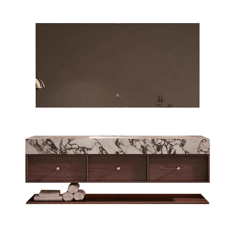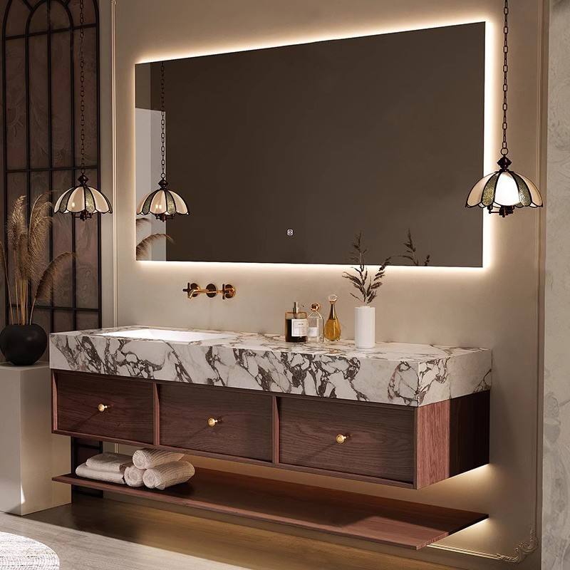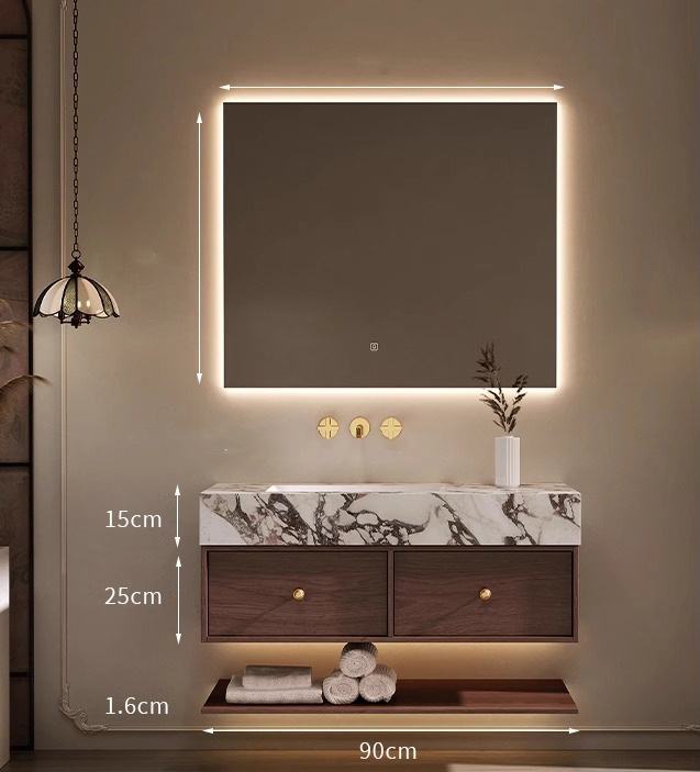 ตู้ห้องน้ำสีวอลนัททันสมัย พร้อมกระจกอัจฉริยะ ไฟ LED สั่งงานด้วยระบบสัมผัส กระจกเรืองแสง วัสดุเมลามีนเคลือบเงา