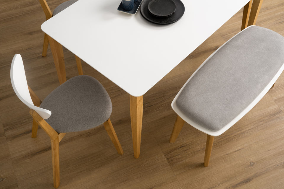 ขาโต๊ะ: ไม้โอ๊คมาเลเซีย ; ที่นั่ง: ผ้าดริลวัสดุ