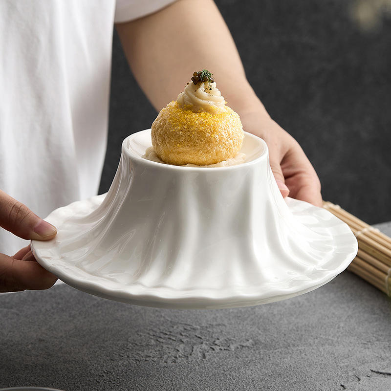 จานเซรามิกสีขาวแบบทันสมัยแนวคิดแบบศิลปะจานของหวานในโรงแรมร้านอาหารโมเลกุลการตั้งค่าบนโต๊ะอาหารแบบไม่สม่ำเสมอ