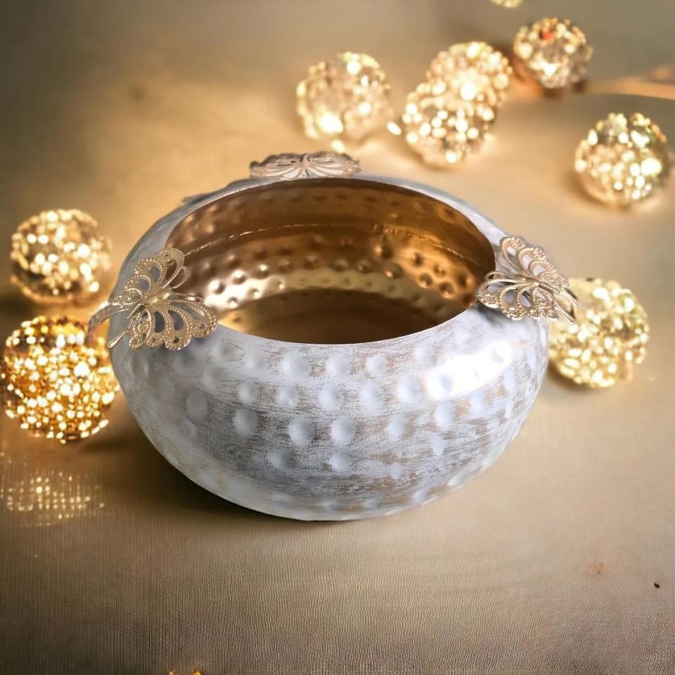 ชามตกแต่งสีขาวลายตอกแบบโมเดิร์น พร้อมลายผีเสื้อ เหมาะสำหรับตกแต่งโต๊ะและตกแต่งบ้านในช่วงเทศกาล จากอินเดีย