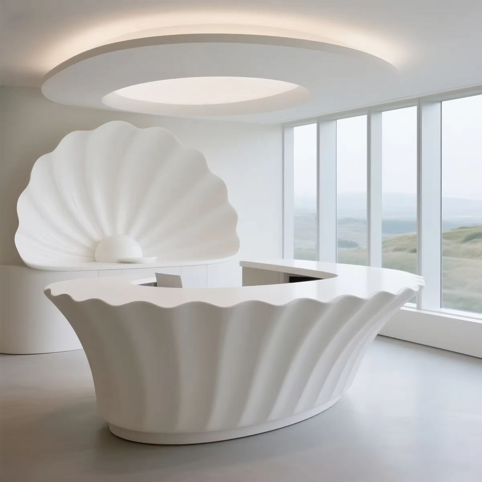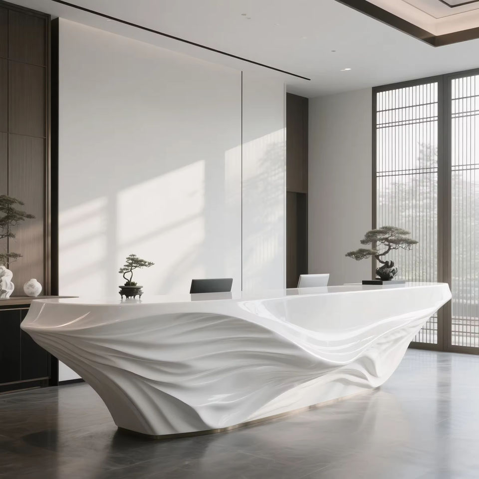 โต๊ะรับรองแขกแบบขยายได้ สีขาว ดีไซน์ทรงคลื่น ผิวมันเงา สำหรับใช้ในสำนักงาน โรงแรม ห้างสรรพสินค้า