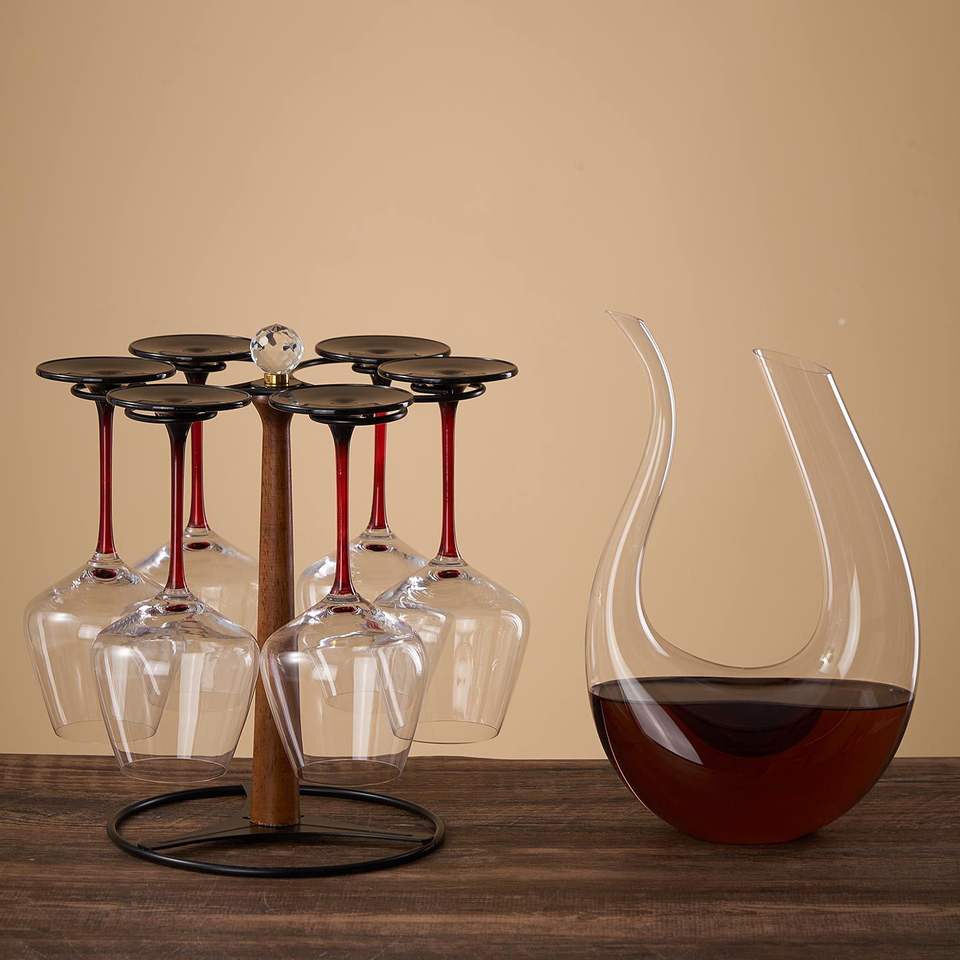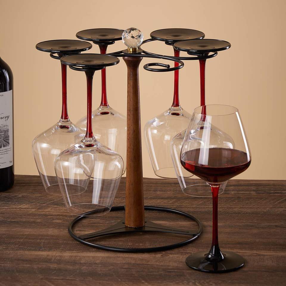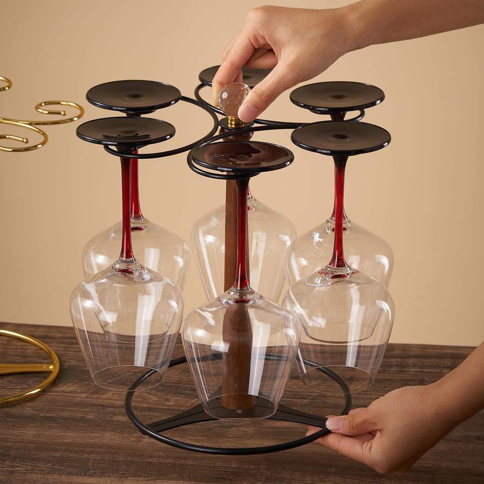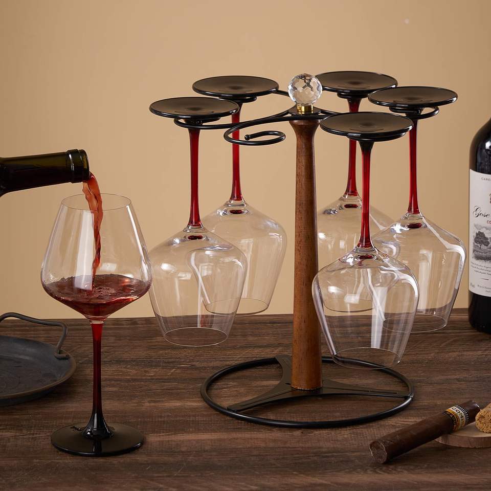 ชั้นวางแก้วไวน์ทันสมัยพร้อมฐานไม้เนื้อแข็งและโครงเหล็กสำหรับจัดแสดงในบ้าน รองรับแก้วไวน์ได้ 5 ถึง 9 ใบ