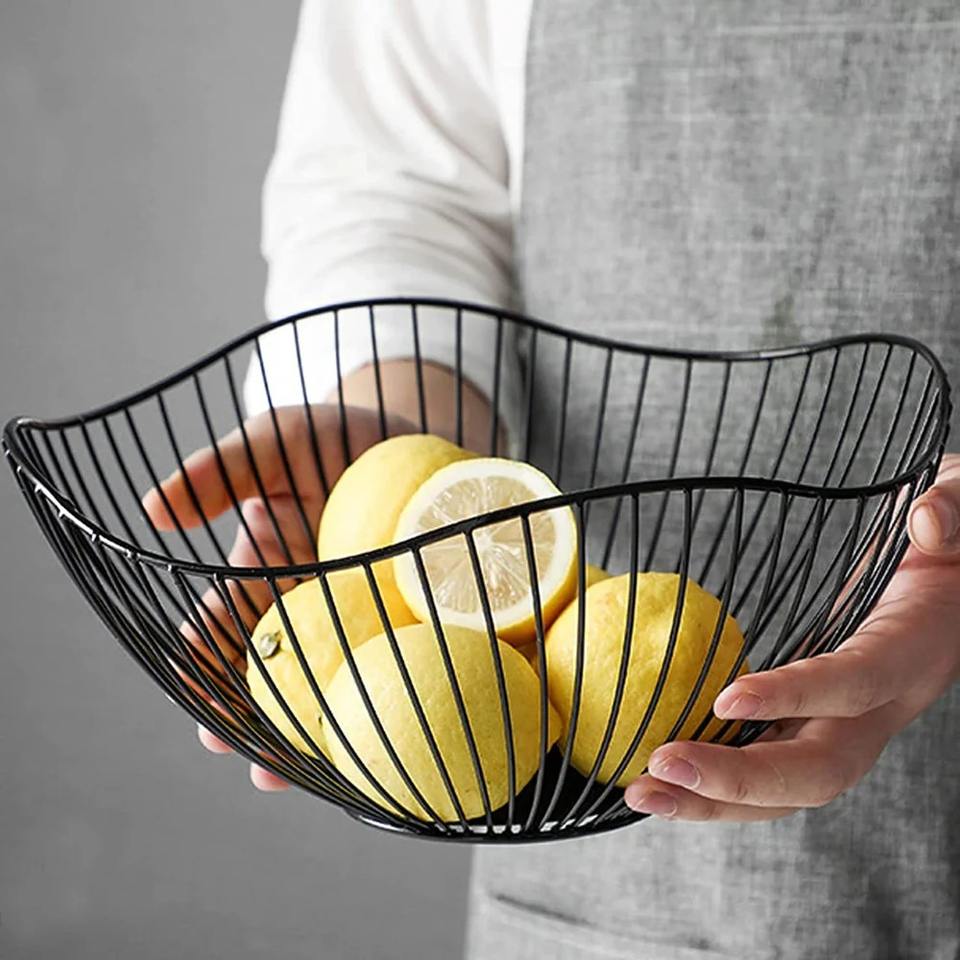 ตะกร้าผลไม้ลวดโลหะสีดำทันสมัยสำหรับตกแต่งเคาน์เตอร์ครัว ชามใส่ผลไม้สำหรับบ้านและโต๊ะอาหาร