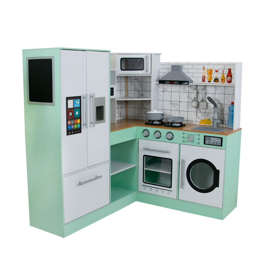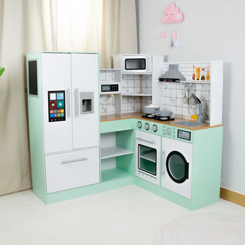 ชุดครัวเด็กเล่นไม้ทรงมุมทันสมัย พร้อมตู้เย็นอัจฉริยะ เตาอบ เตาแก๊ส อ่างล้างจาน และเครื่องซักผ้า ชุดของเล่นเสริมพัฒนาการแบบมอนเตสซอรี่