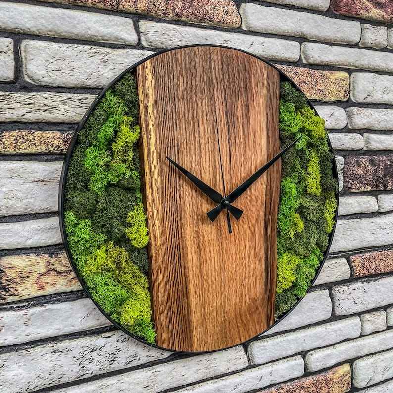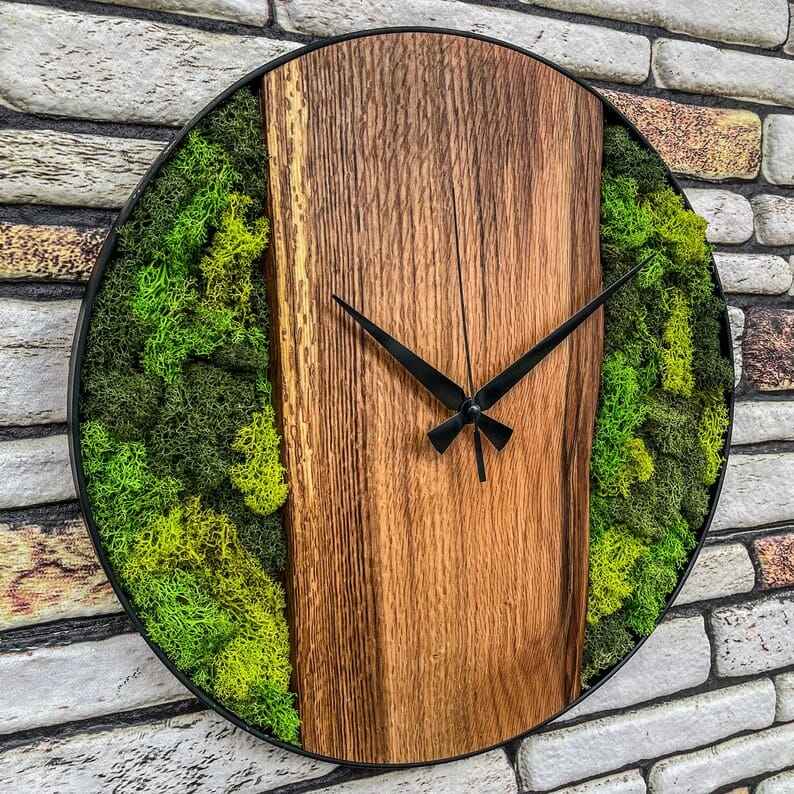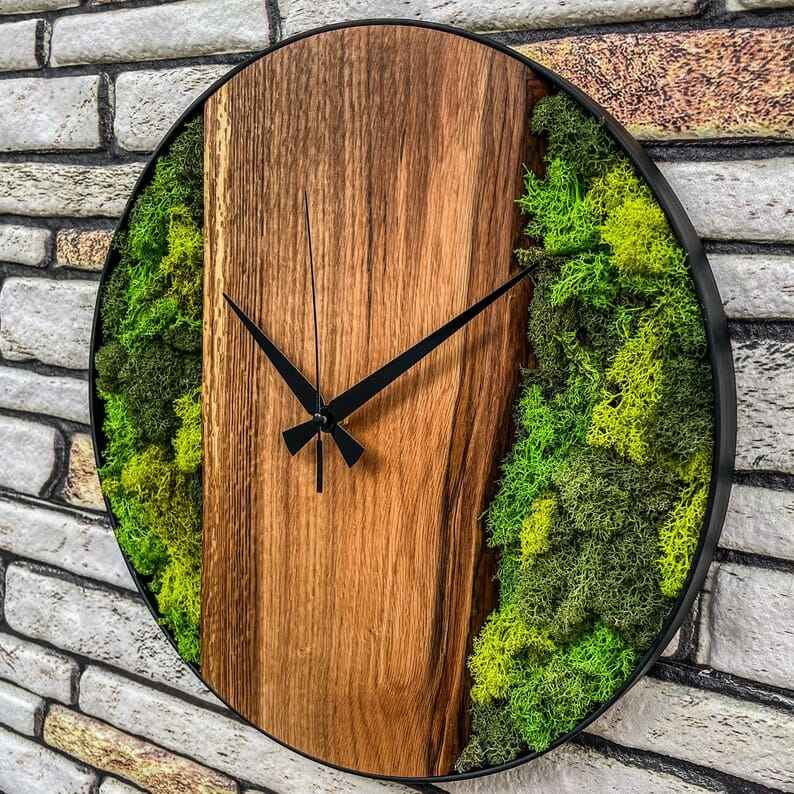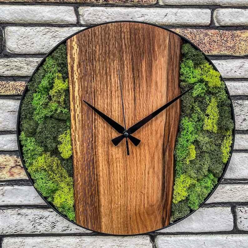 นาฬิกาแขวนผนังไม้โมเดิร์นตกแต่งด้วยมอสธรรมชาติ ทำด้วยมือ นาฬิกาแขวนผนังทรงกลมสไตล์เรียบง่ายสำหรับตกแต่งบ้าน แบบไร้เสียง