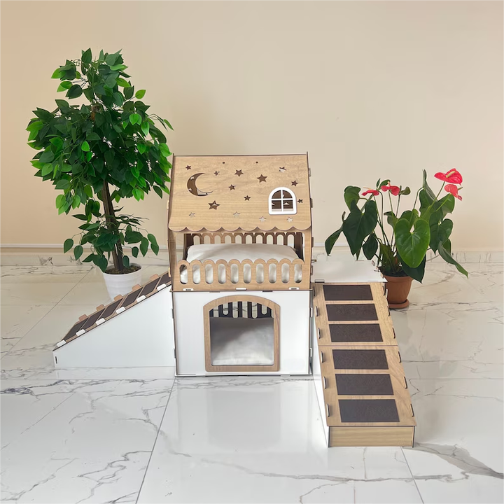 บ้านสัตว์เลี้ยงสองชั้นไม้สไตล์โมเดิร์น ดีไซน์เคลื่อนย้ายได้ รูปแบบกระต่าย เฟอร์นิเจอร์ไม้