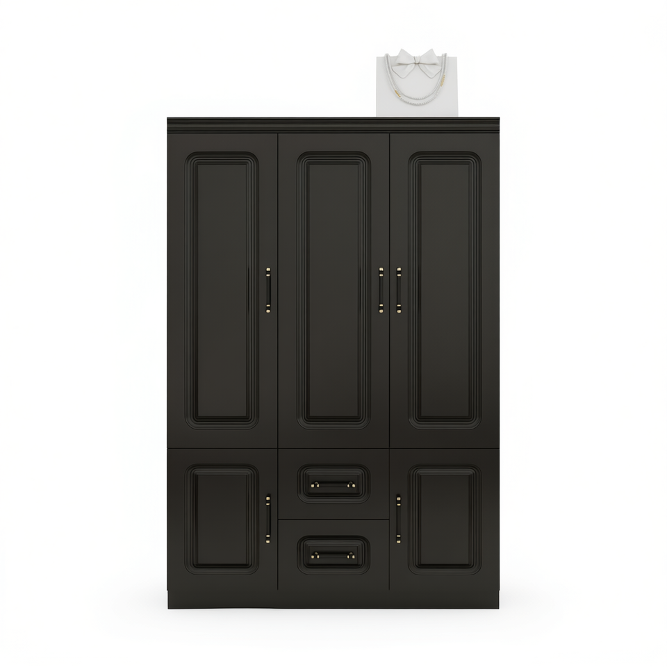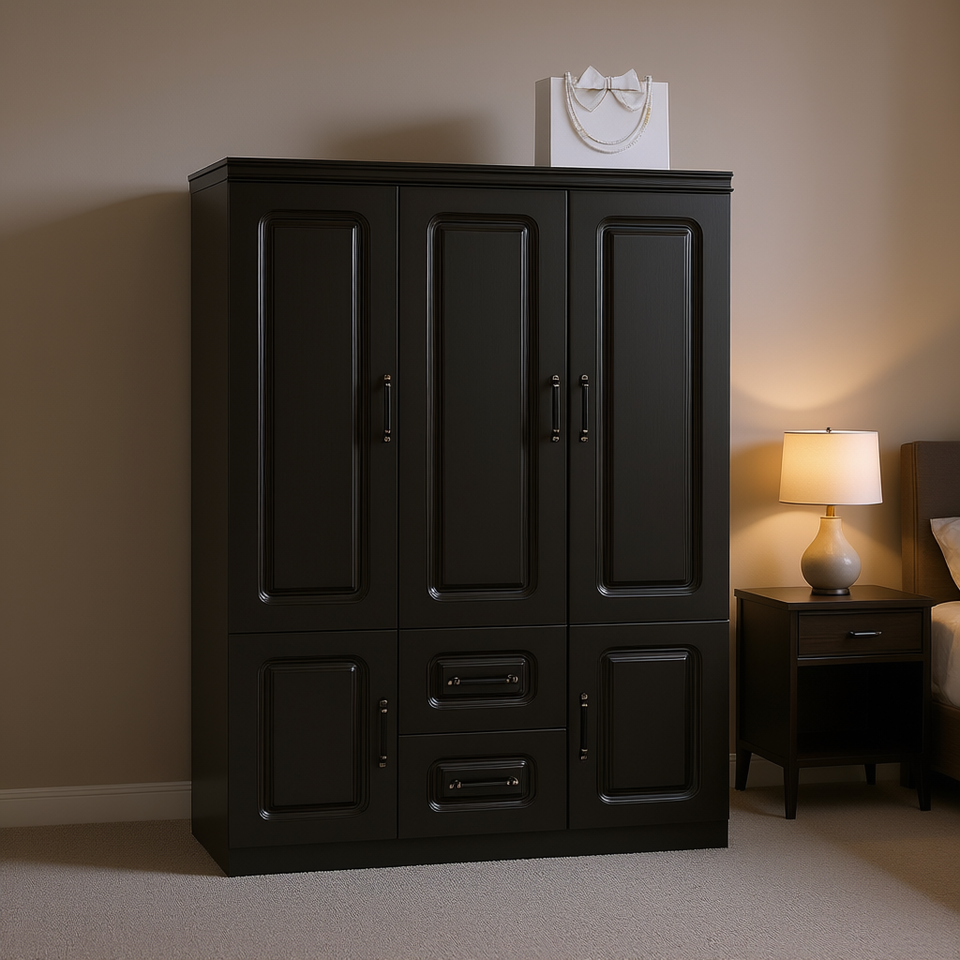 ตู้เสื้อผ้าไม้โมเดิร์น 3 ประตู ตู้สูงพร้อมลิ้นชัก 2 ช่องและชั้นวางของ สีดำ รุ่น D0100XTYQUA