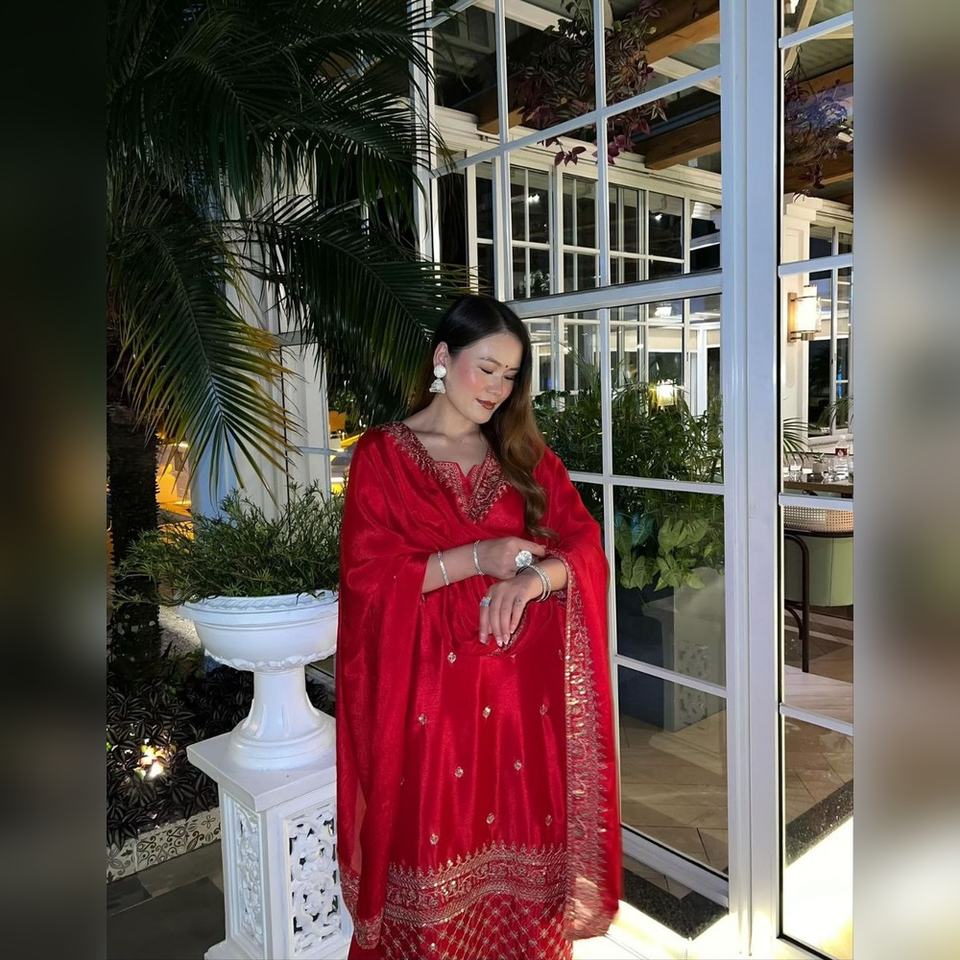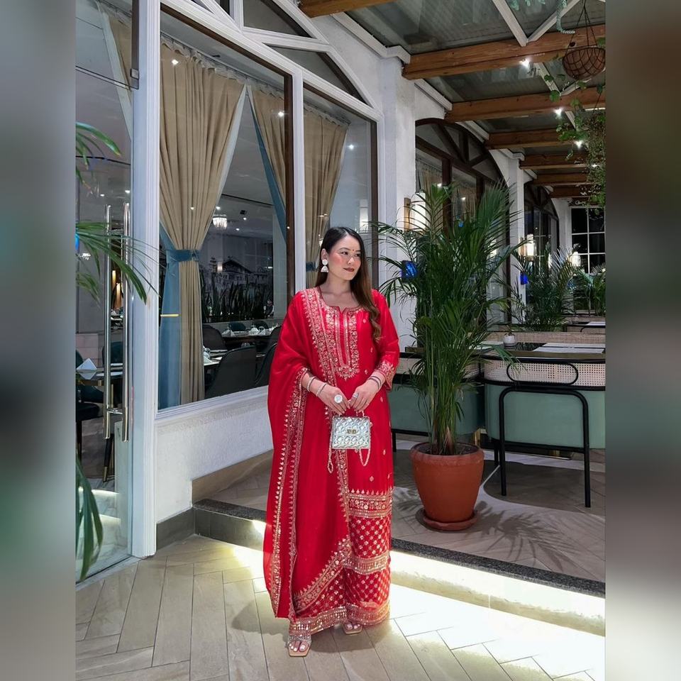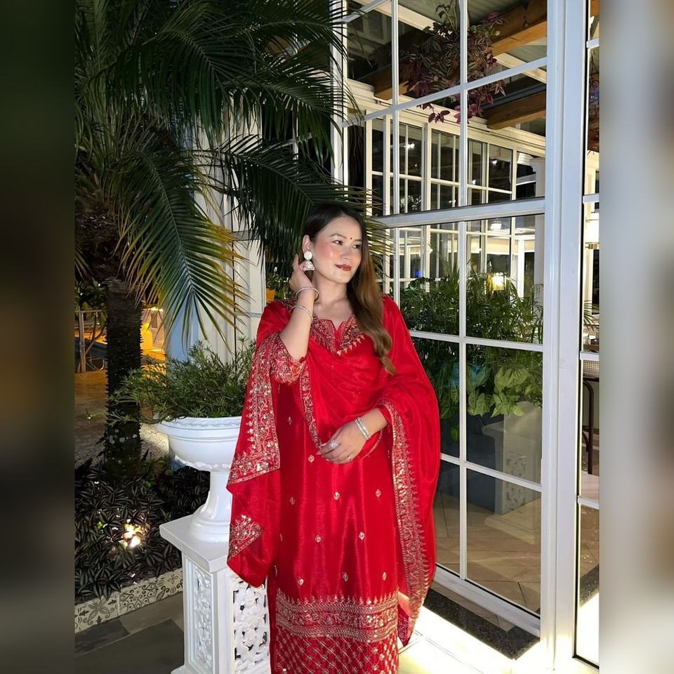 ชุดส่าหรีแบบโมเดิร์นหลากสี ผ้าชีนอน พร้อมงานปักเรซาม์ ดีไซน์หรูหรา พร้อมผ้าคลุมไหล่แฟนซี คอลเลคชั่นปี 2025