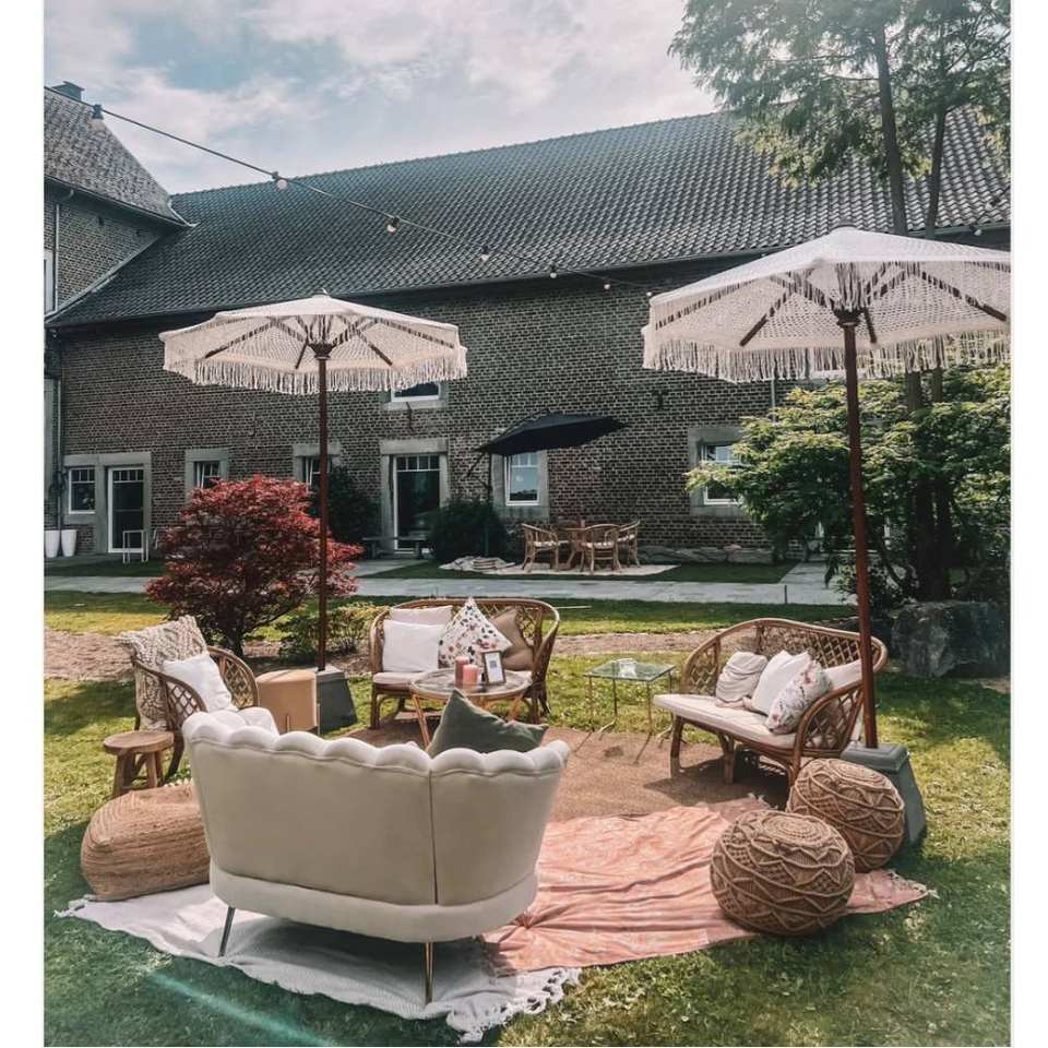 ร่มชายหาดสไตล์โบฮีเมียนทันสมัยขอบภาพถักโครเชต์ทำด้วยมือวัสดุไม้สำหรับตกแต่งกลางแจ้งแบบธรรมชาติฤดูร้อน