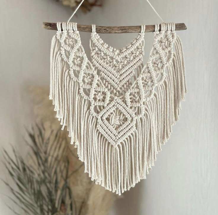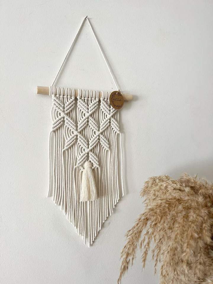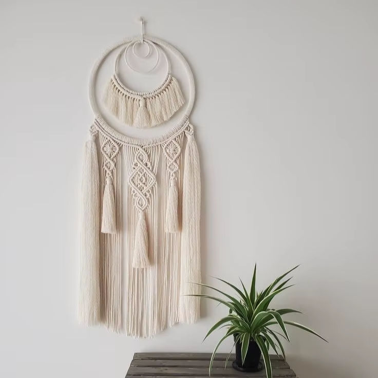 ศิลปะแขวนผนังสไตล์โบฮีเมียนเมคราเม่ทันสมัยพร้อมดีไซน์สมมาตรเพื่อโทนสีกลางห้องนั่งเล่นหรือของตกแต่งทางเข้า