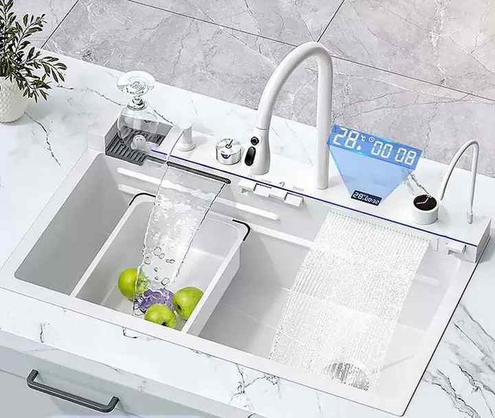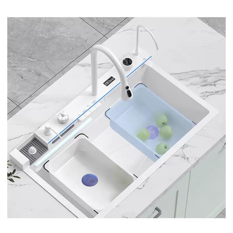 อ่างล้างจานแบบฝังทรงสี่เหลี่ยมทันสมัยพร้อมก๊อกน้ำแบบดึงลงหมุนได้ 360 องศา