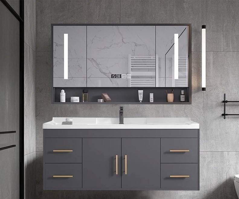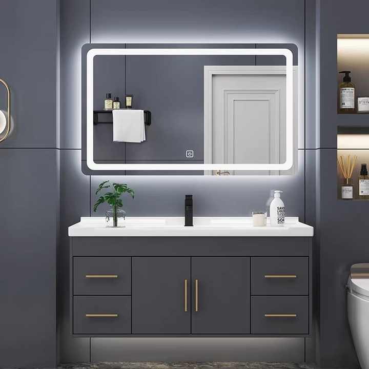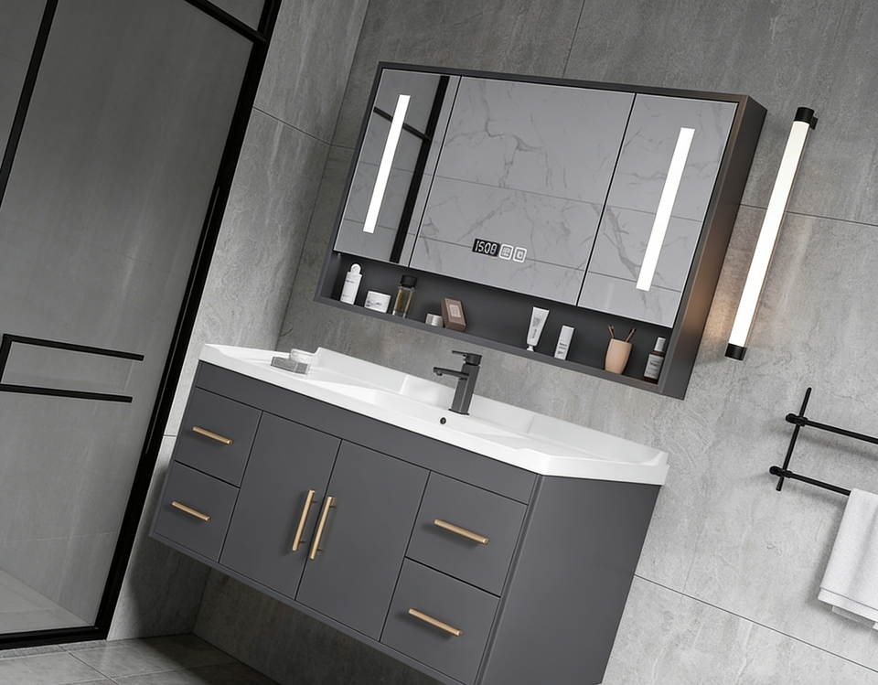ชุดอ่างล้างหน้าติดผนังสีเทาสไตล์โมเดิร์น พร้อมตู้กระจกอัจฉริยะและอ่างเซรามิกที่ทนทาน
